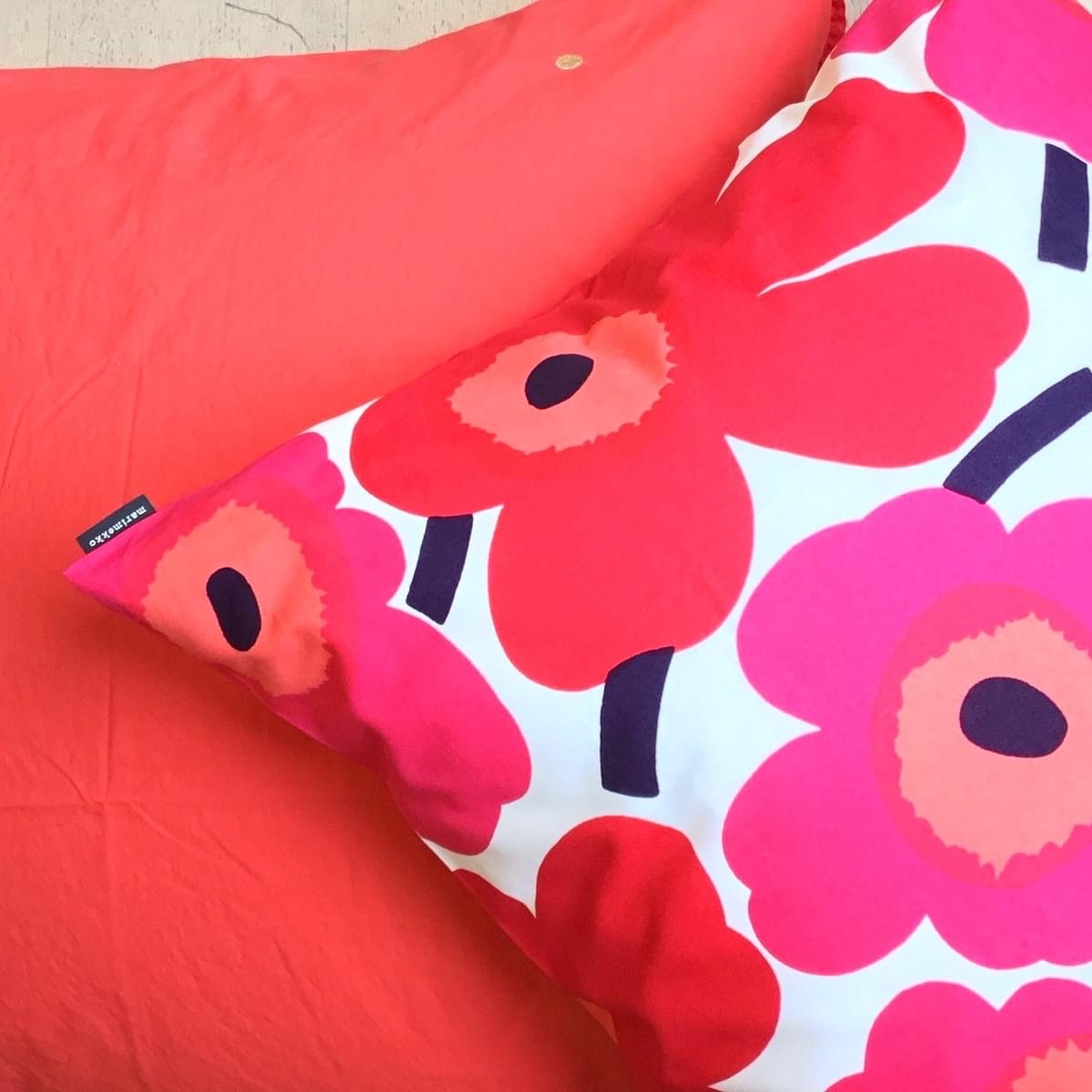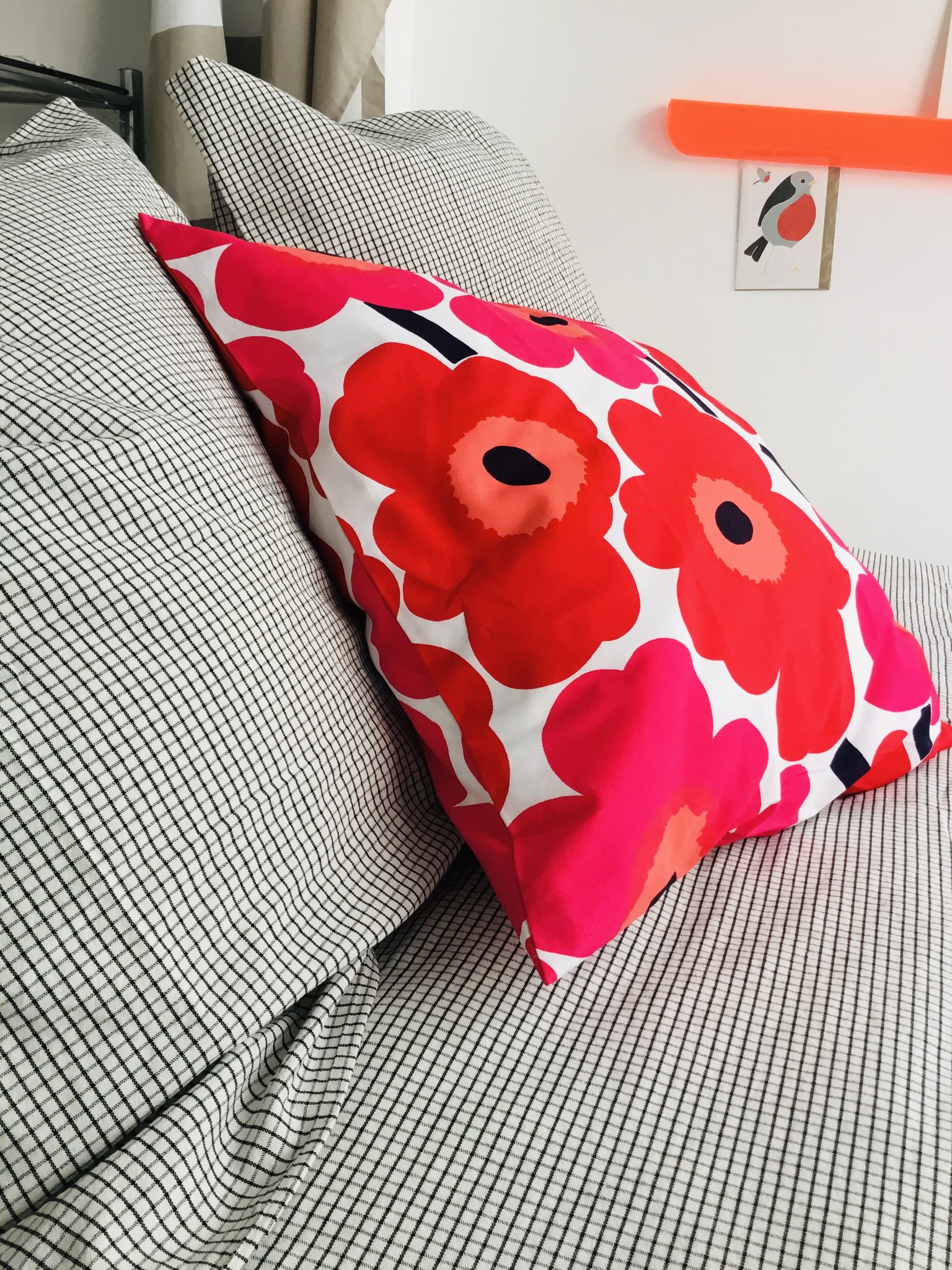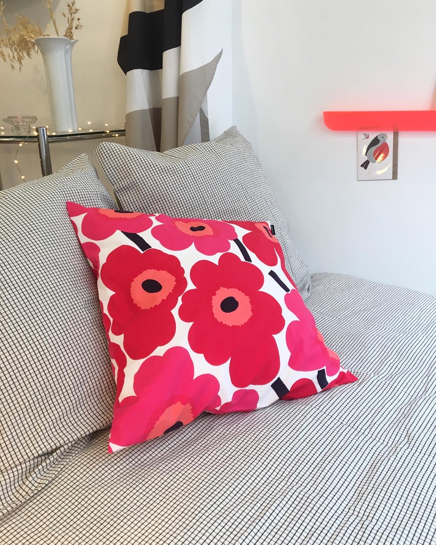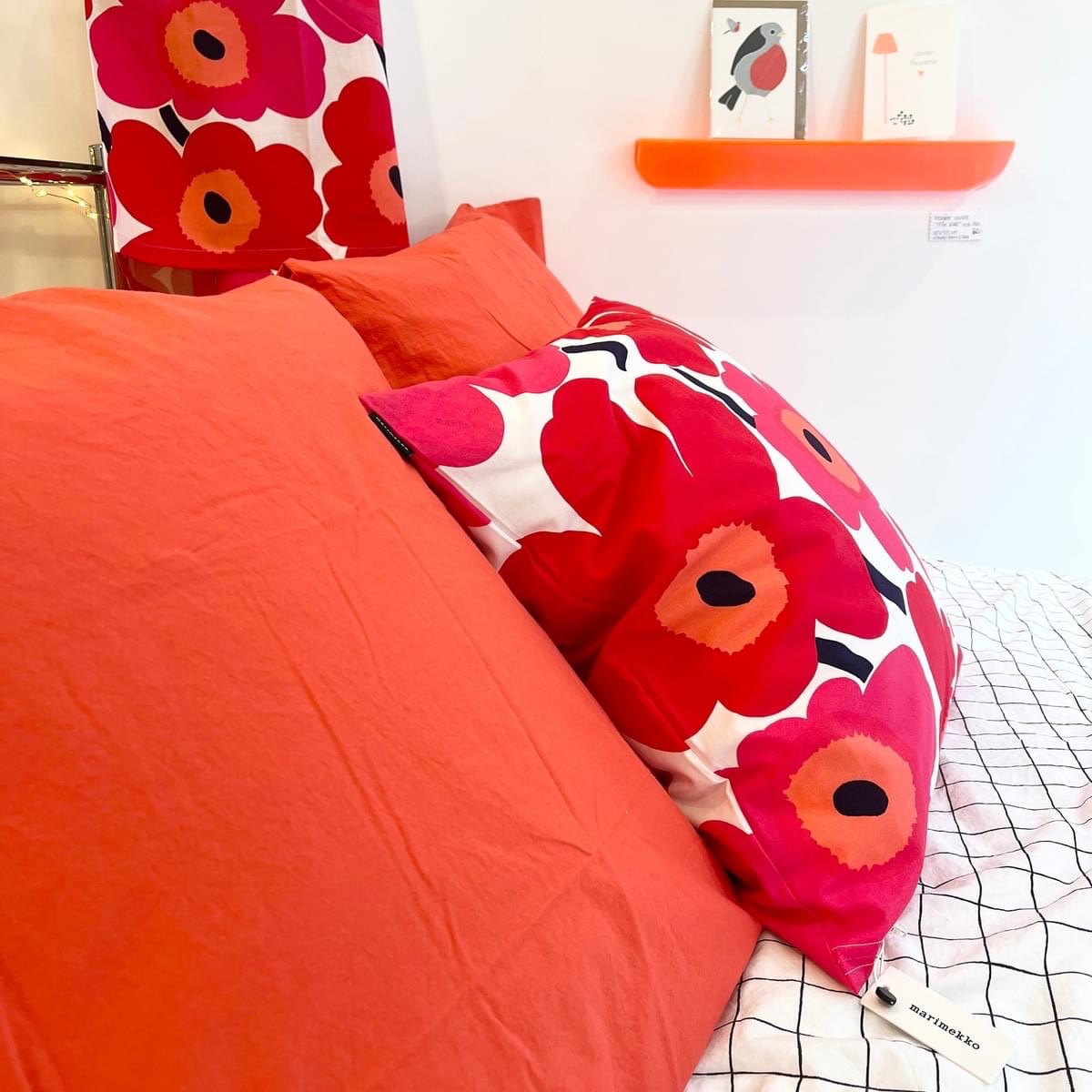Alors, on va être honnête avec vous : le rouge n’est au départ pas notre couleur préférée MAIS on doit l’avouer, nous nous sommes définitivement laissées gagner par la bonne humeur imparable qu’il dégage ! Ce rouge cerise, éclatant, est subtilement mélangé avec des teintes fuchsia et oranges sur les articles déclinés par Marimekko. Il contraste parfaitement avec les draps écru et noir de La Cerise sur le Gâteau : demandez Gustave pour le carreau, Léonie pour le motif ligné et Oscar pour le grand carreau! Le combo est également impeccable avec les nouvelles et vivifiantes taies corail de la marque. Venez découvrir ces textiles en boutique !