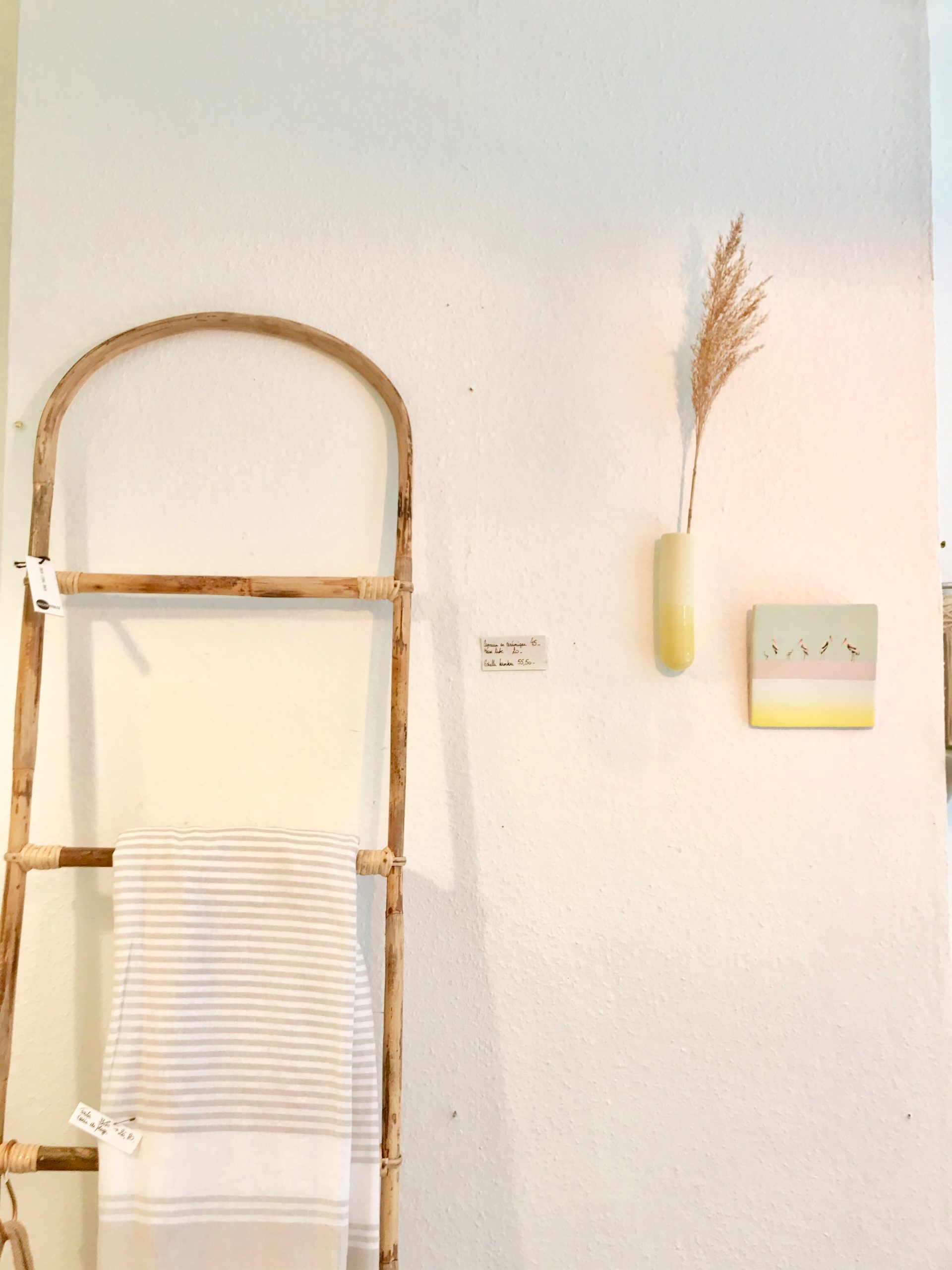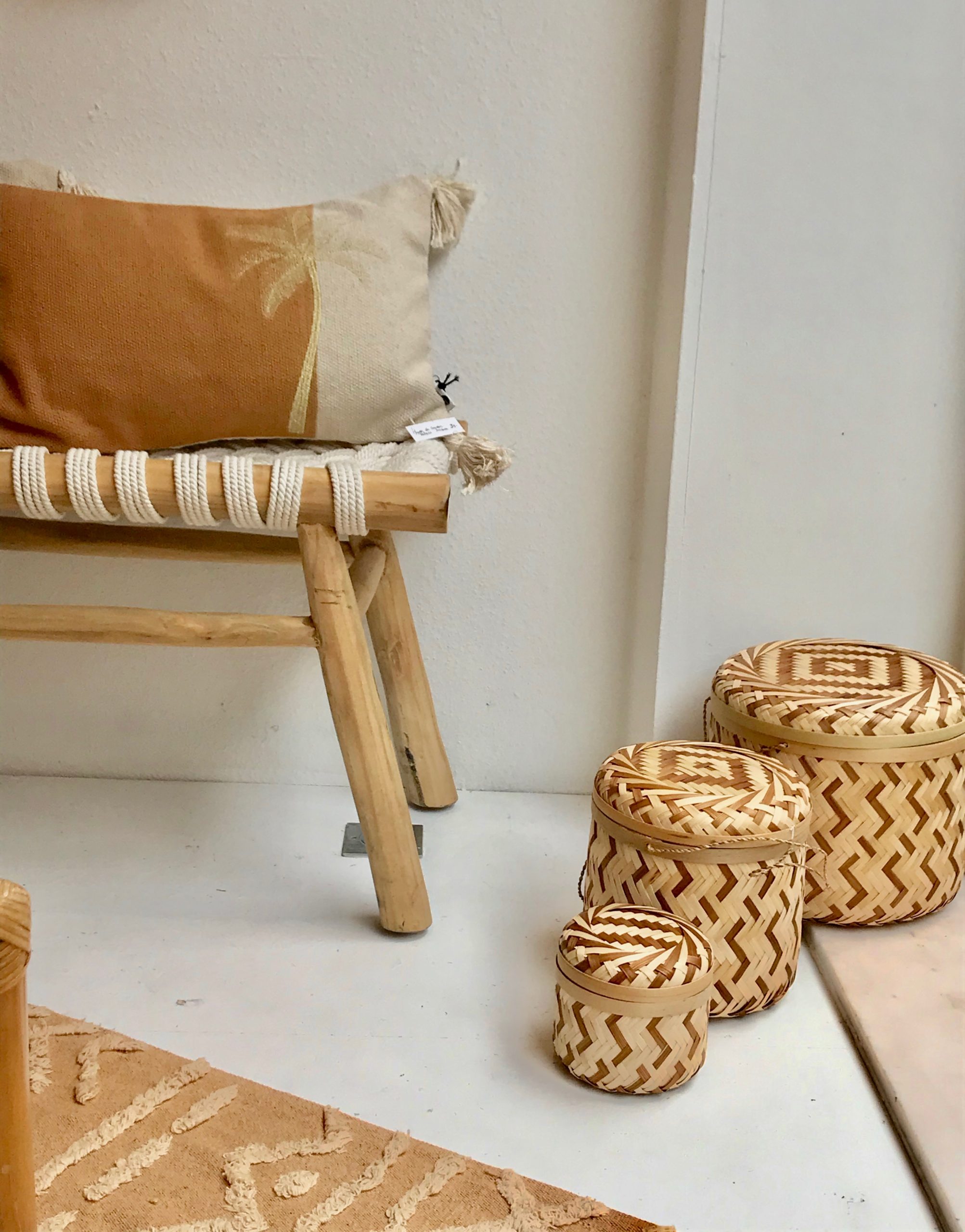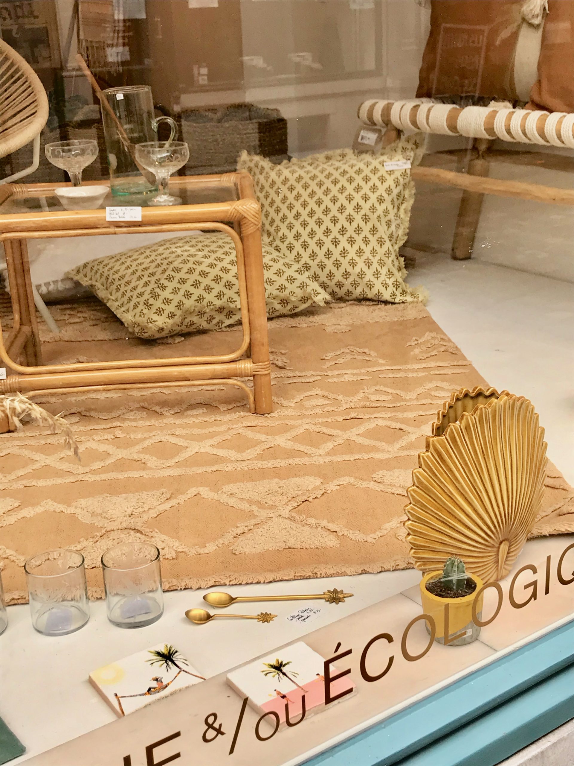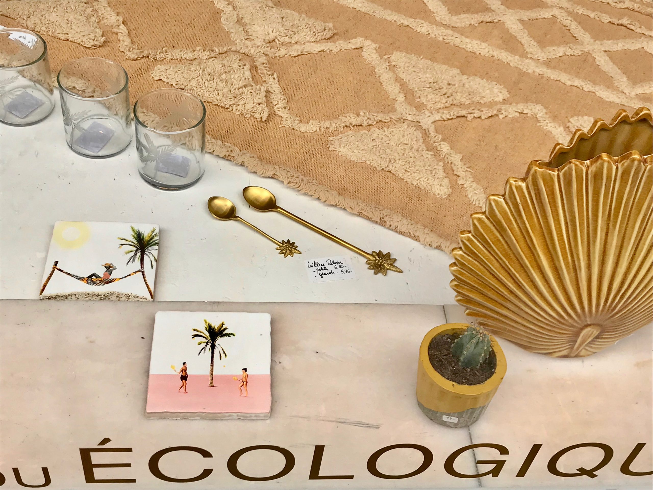 1. Fauteuil corde style acapulco * Madam Stoltz – 275 € | 2. Foutas de plage * Madam Stoltz – 33,50 € 26,80€ | 3. Miroir oeil ethnique * Madam Stoltz – 82,75€ | 4. Cuillère “Palmier” * Madam Stoltz – 9,75 € | 5. Plumes en macramé artisanal * CREATEUR BELGE Mostri Mostrini – 40 € | 6. Vase “feuille” en céramique jaune moutarde * Madam Stoltz – 34,50 € | 7. Tirage A4 “Palmiers” * CREATEURS BELGES h.O.&M.e. – 40€ / Kit de suspension A4 en bois * Monsieur Papier – 20 € | 8. Verre “Beldi” jaune * Madam Stoltz – 6,25 € / pièce | 9. Pailles en bambou réutilisables * Original Home – 8€ | 10. Tapis “Tribu” honey 120×160 cm * Lorena Canals – 99 € | 11. Banc en teck recyclé et macramé * Original Home – 220 € | 12. Housse de coussin 30×50 Palmier lurex doré * Madam Stoltz – 31€ | 13. Carreaux muraux décoratifs en céramique * Story Tiles – 25 € / pièce