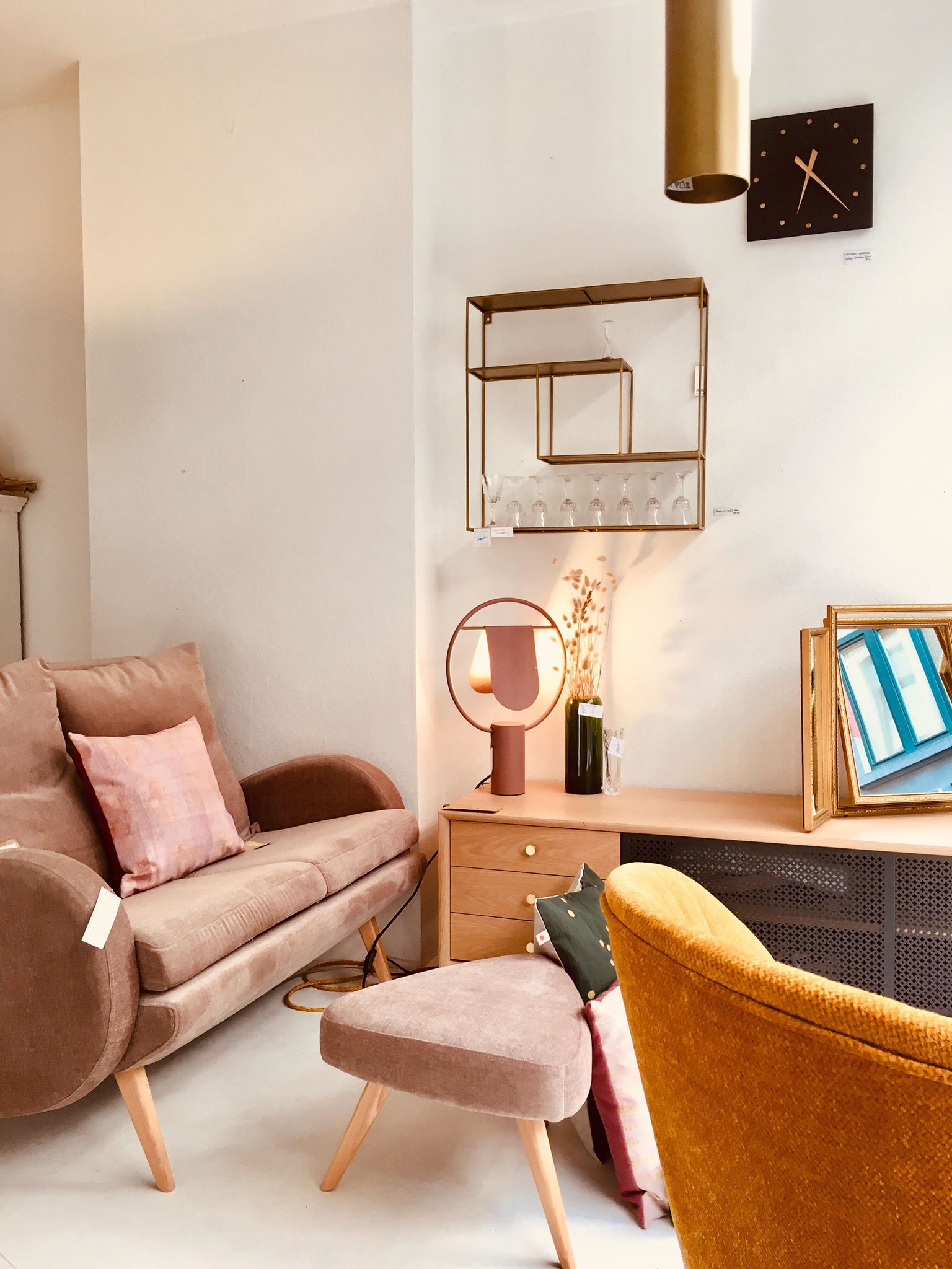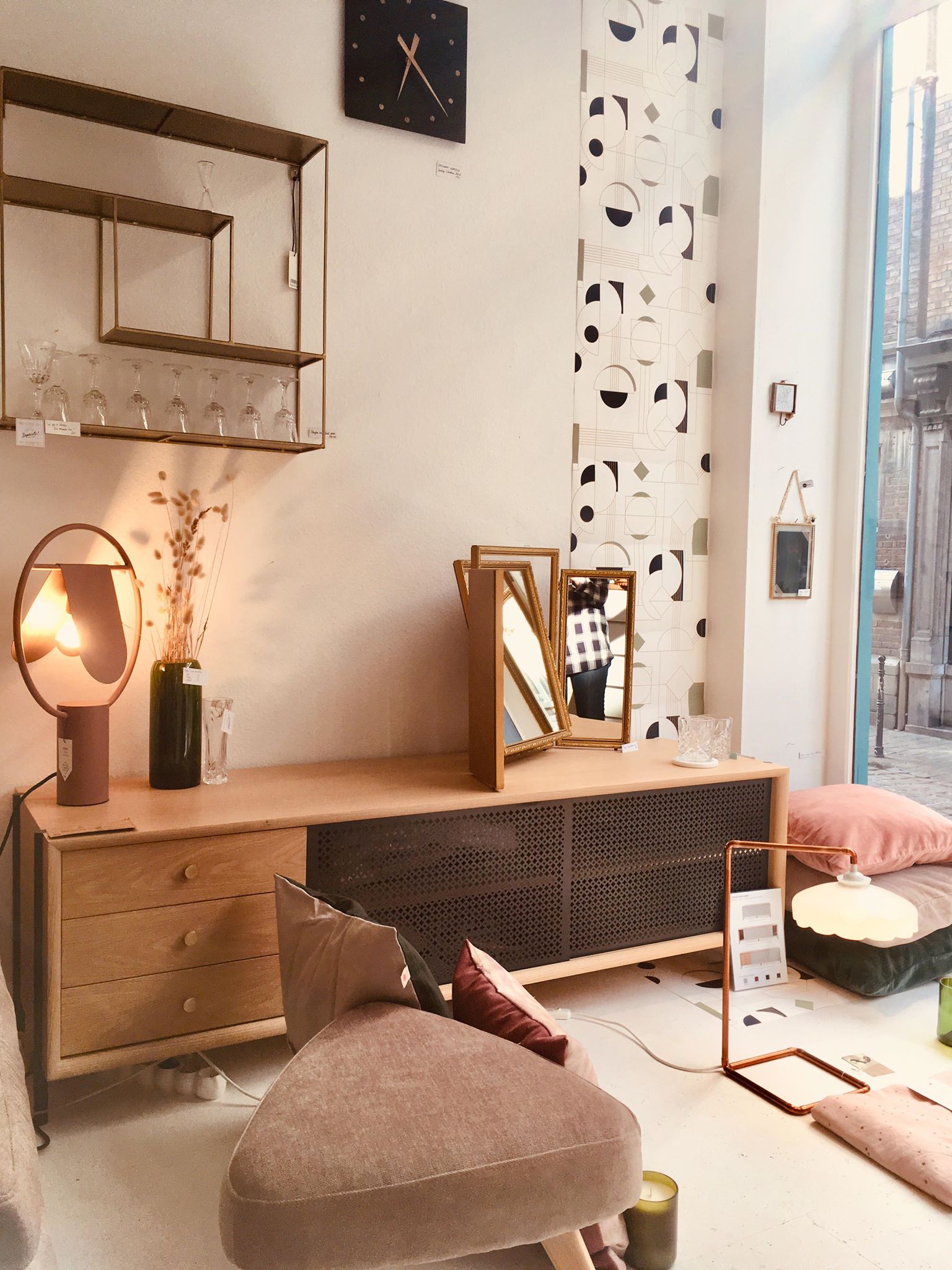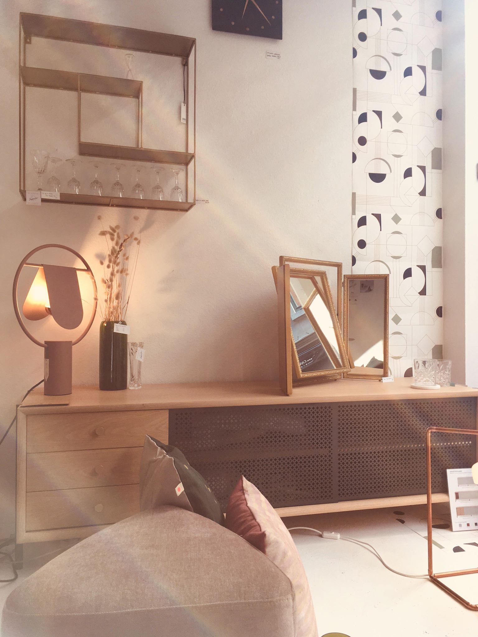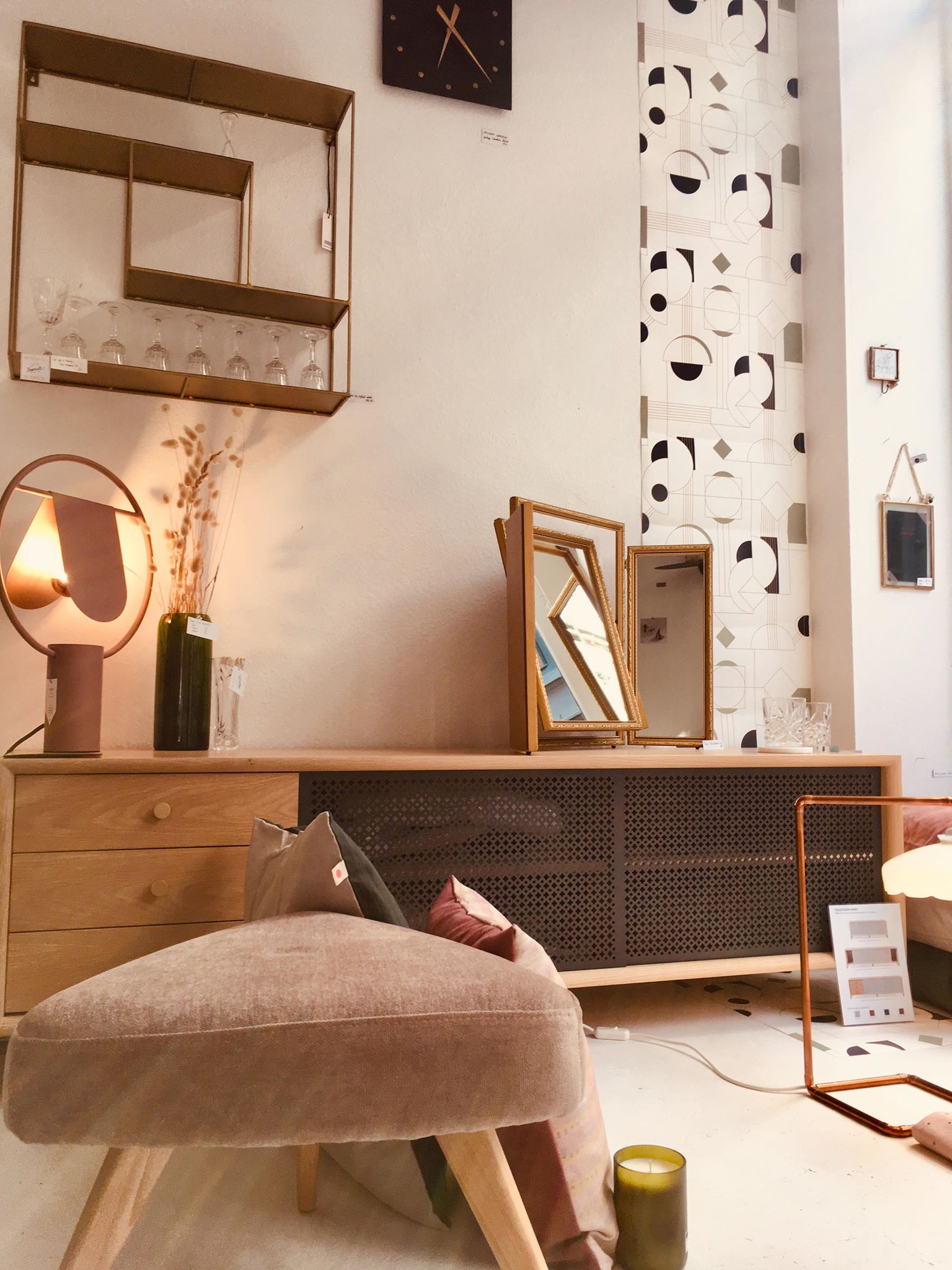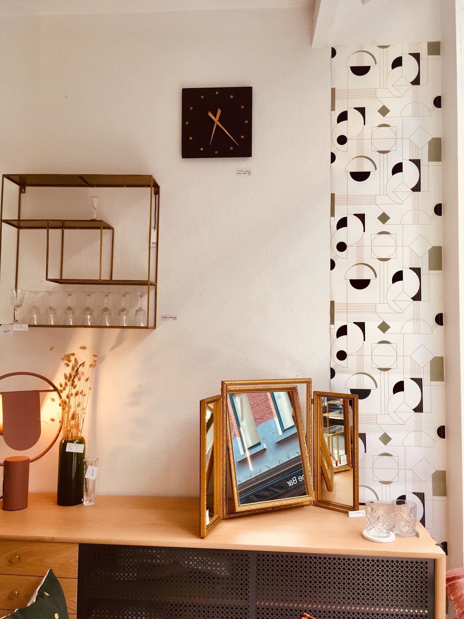 1. Papier peint “Daisy” * Papermint – lé de 3m : 57,90€ | 2. Set de 2x serviettes de table Lina biscuit or * La Cerise sur le Gâteau – 18€ | 3. Horloge murale * Kloq – 179€ | 4. Suspension géométrique en laiton * Madam Stoltz – 115€ | 5. Carreau décoratif en céramique 10x10cm “Go with the flow” * Story Tiles – 25€ | 6. Horloge murale * Sébastien Dehut (Créateur belge!) – 130€ | 7. Verre à whisky * Madam Stoltz – 7,50€ | 8. Fauteuil “Chenille” * Madam Stoltz – 323,95€ | 9. Housse de coussin 50x50cm Lina pluie Or biscuit * La Cerise sur le Gâteau – 38€ | 10. Housses de coussin velours 50×50 cm * Madam Stoltz – 26,25€ | 11. Set de 4 verres “Long drink” * Q de bouteilles – 49€ | 12. Etagère rectangulaire en laiton * Madam Stoltz – 99,95€ | 13. Lampe à poser “Anaë” * Harto Design – 240€