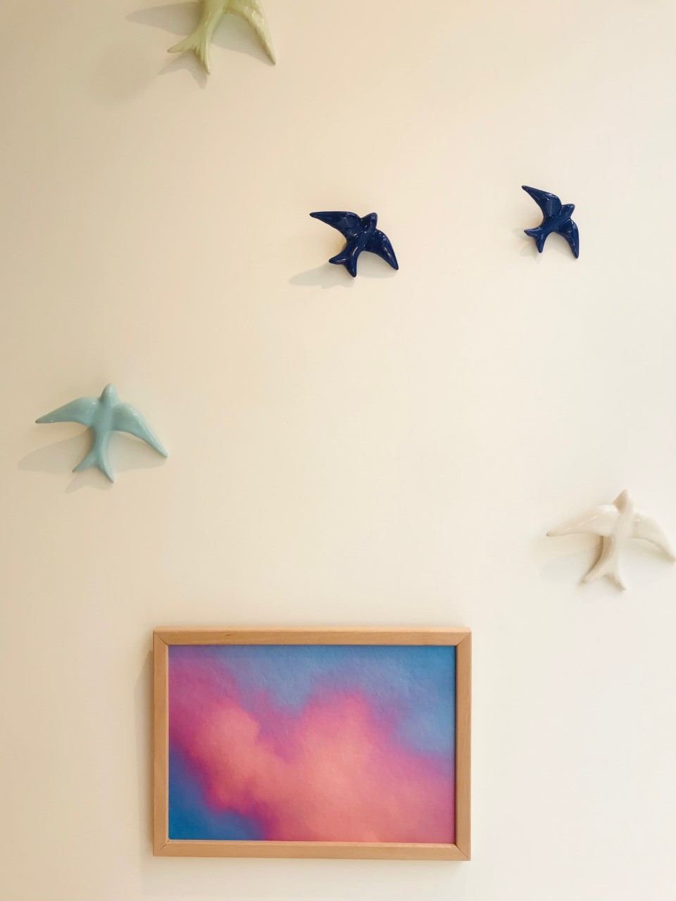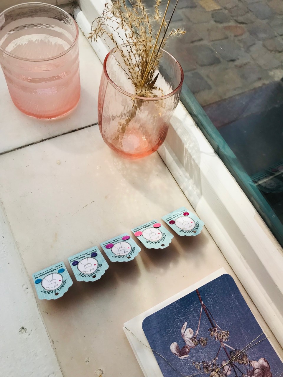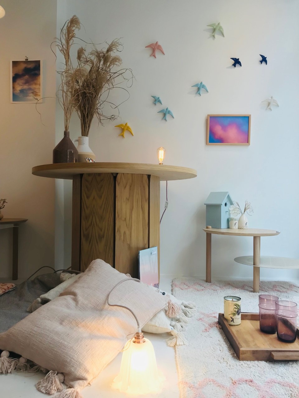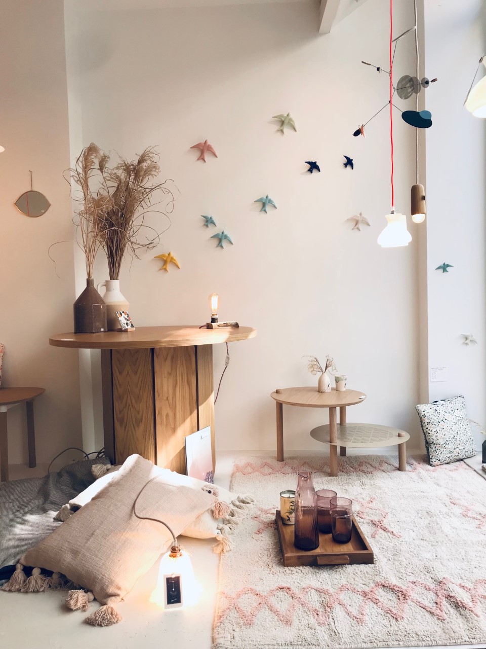 1. Table d’appoint “By Colette” en contreplaqué chêne tablette métal finition dorée * Dizy Design – 199 € | 2. Hirondelles murales, plusieurs tailles et couleurs * Casa Atlantica – à partir de 9 € | 3. Tapis Arc-en-ciel 60x90cm * Madam Stoltz – 35,50 € | 4. Verres en verre recyclé pourpre * Madam Stoltz – 8,50 € | 5. Set de 2 sets de table + serviette en lin belge sérigraphié * Tamara Louis – 30 € | 6. Carte A6 et enveloppe “Ciel 90’s” et “Ciel Barbapapa” * h.O.&M.e. édition – 5 € | 7. Vase oiseau * Kesemy design – 19,50 €