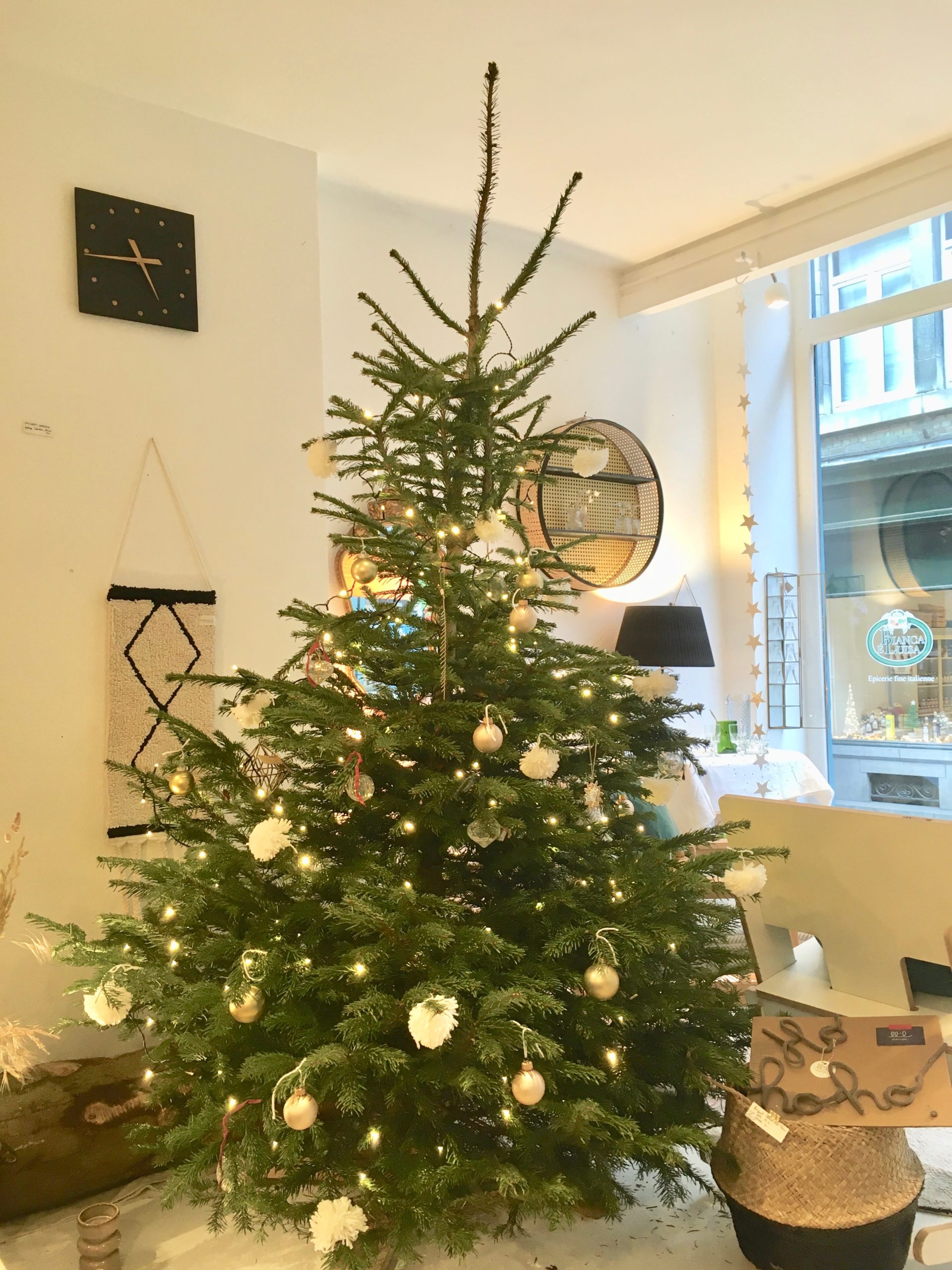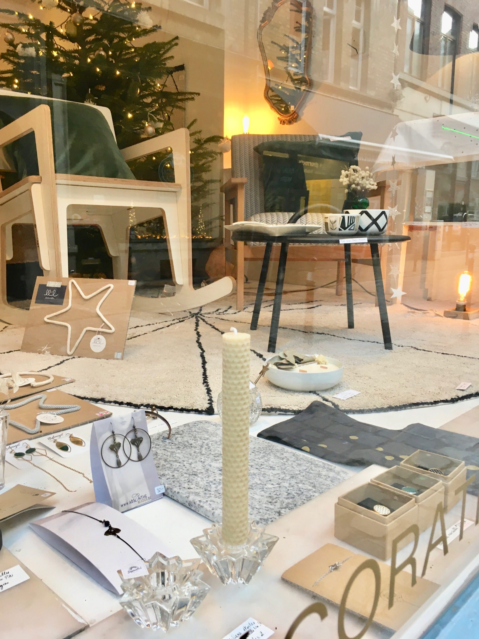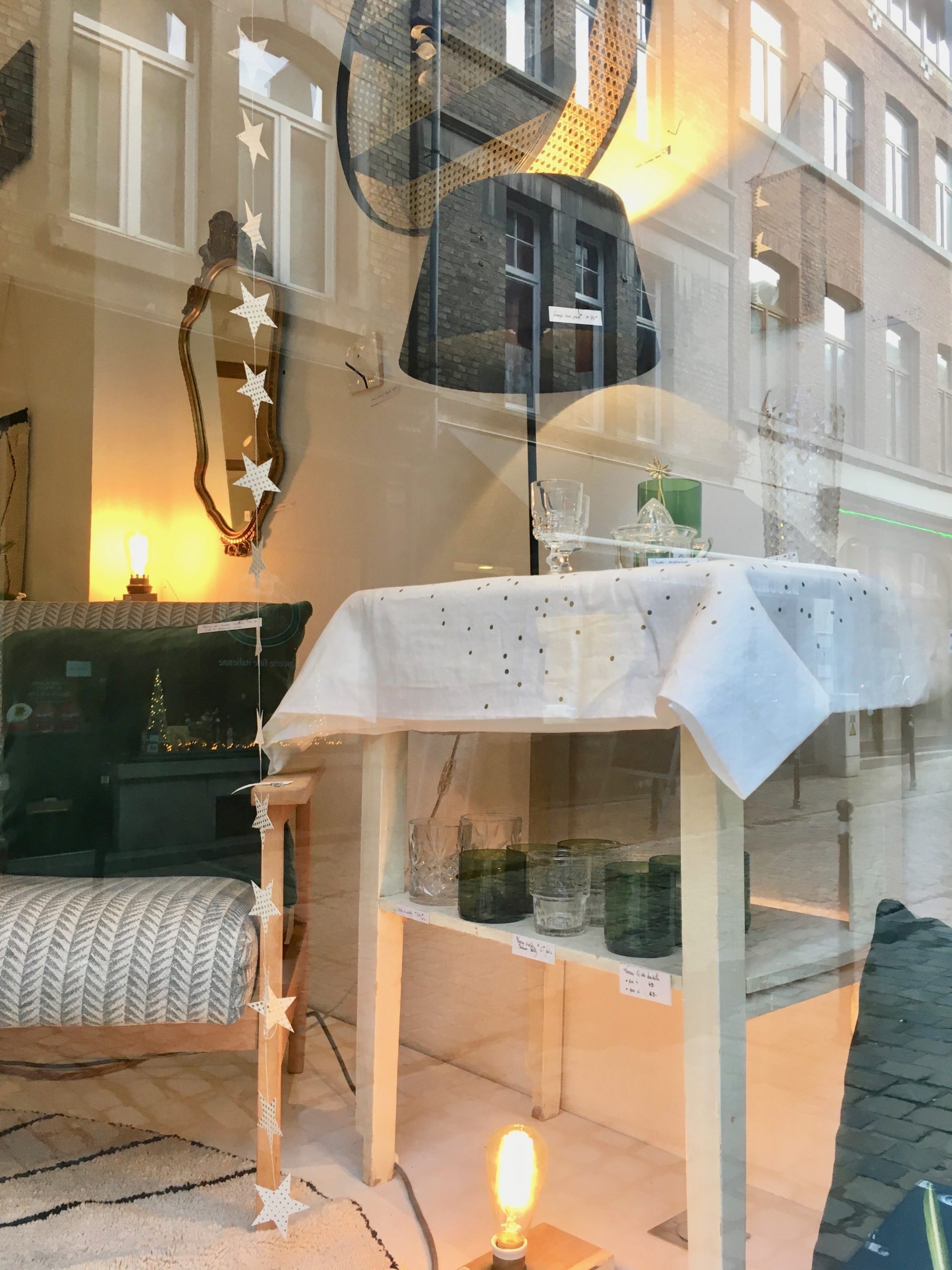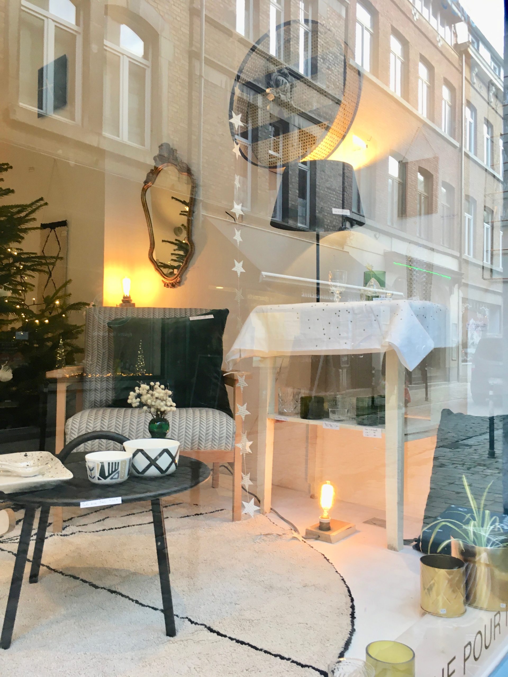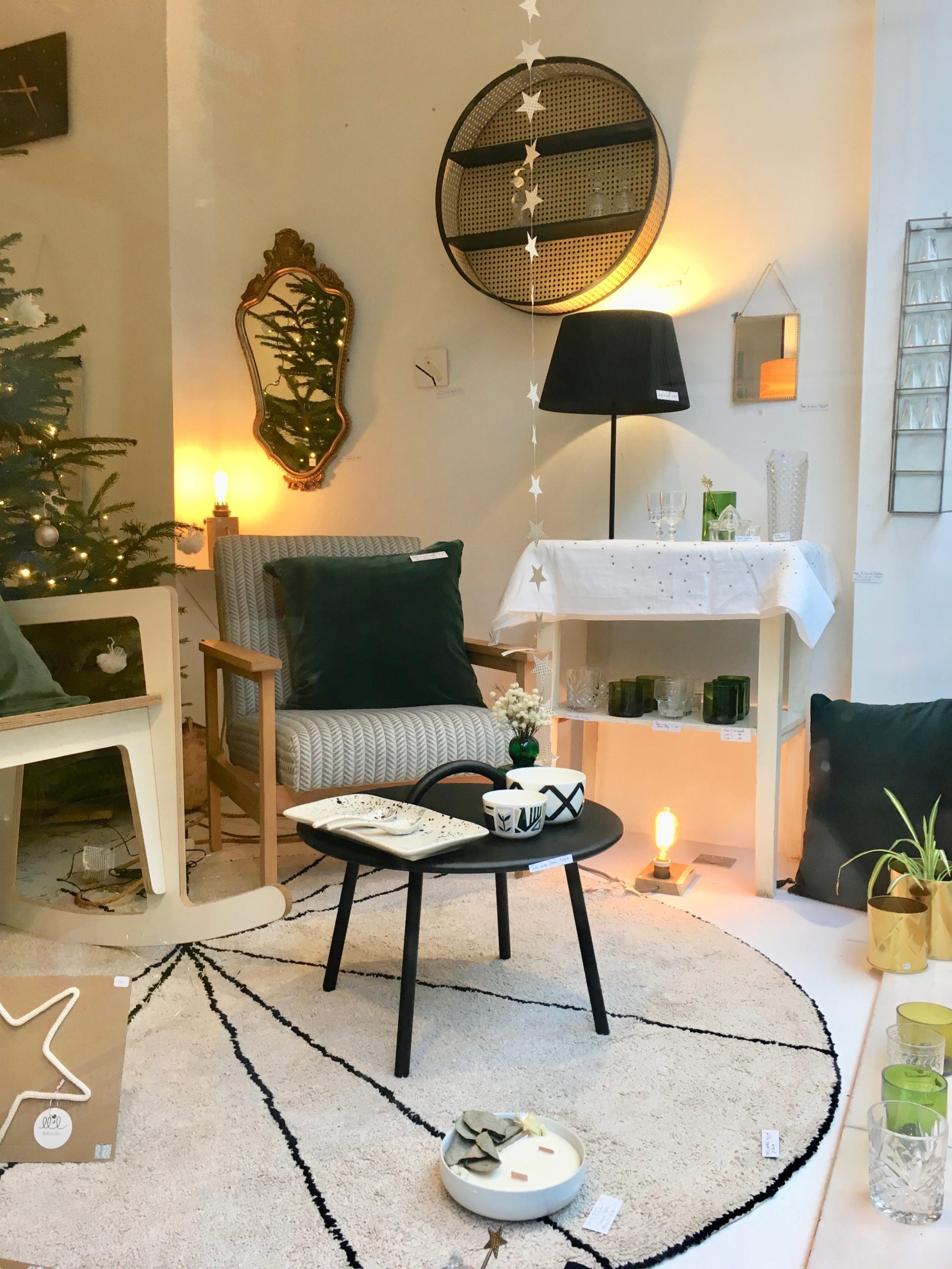 1. Etagère bois et cannage ronde (60cm diam.) * Madam Stoltz : 110 € | 2. Housse de coussin velours 50x50cm * Madam Stoltz – 26,50 € | 3. Housse de coussin Lina mpluie or caviar 30×50 cm * La Cerise sur le Gâteau – 30€ | 4. Set de 4 verres recyclés “Débattre” * Q de bouteilles – 49€ | 5. Cuillère étoile * Nkuku – 8€ | 6. Verres ciselés transparents * Madam Stoltz – 6€/pièce | 7. Tapis “Trace” beige (160cm de diam.) * Lorena Canals – 155€ | 8. Vase “Flower” vert * Marimekko – 45€ | 9. Set de 2x serviettes de table milk * La Cerise sur le Gâteau – 18€ | 10. Nappe Lina pluie or milk 160x250cm * La Cerise sur le Gâteau – 89€ | 11. Chandelier miroir/laiton étoile * Madam Stoltz – 10€.