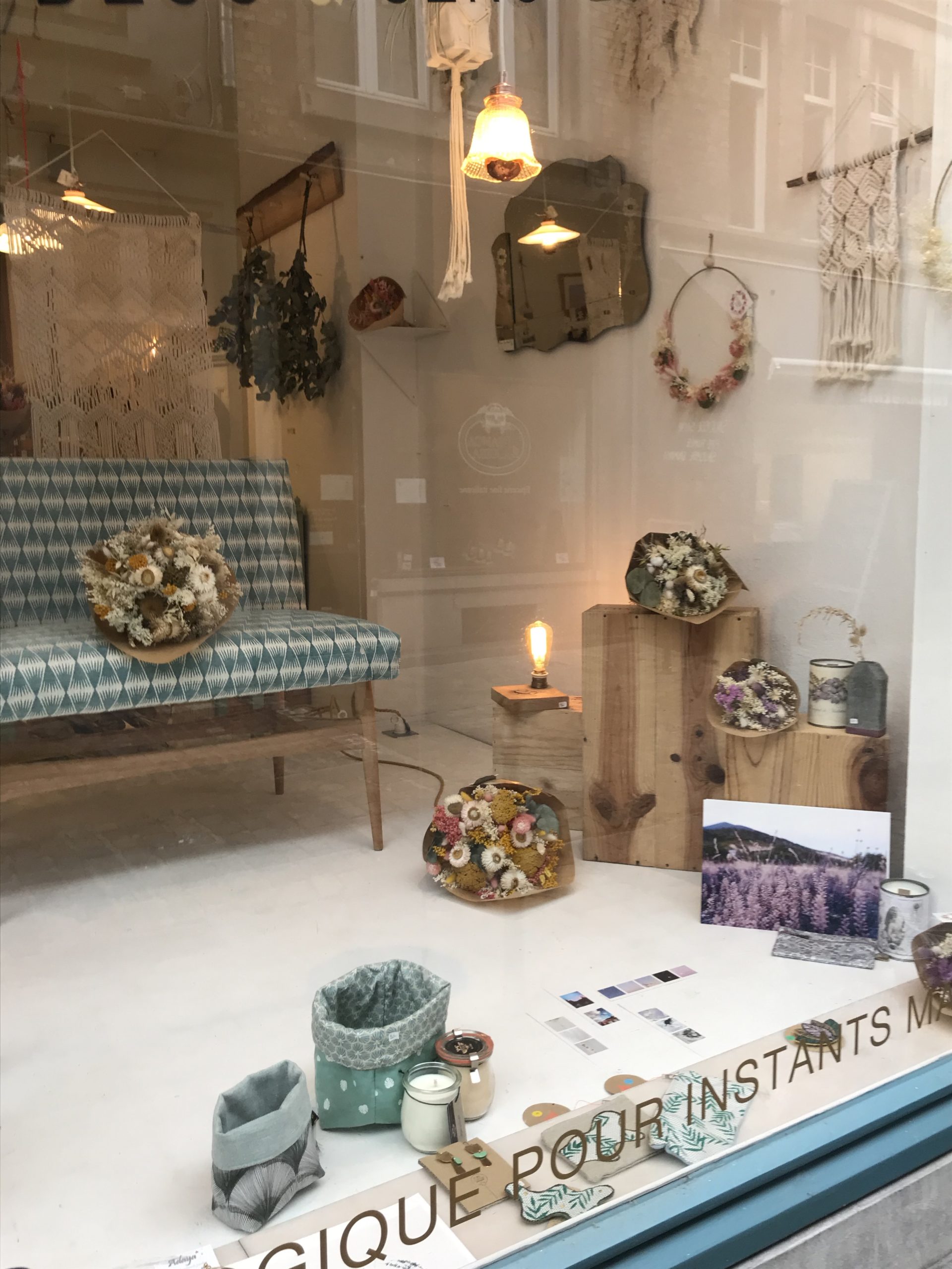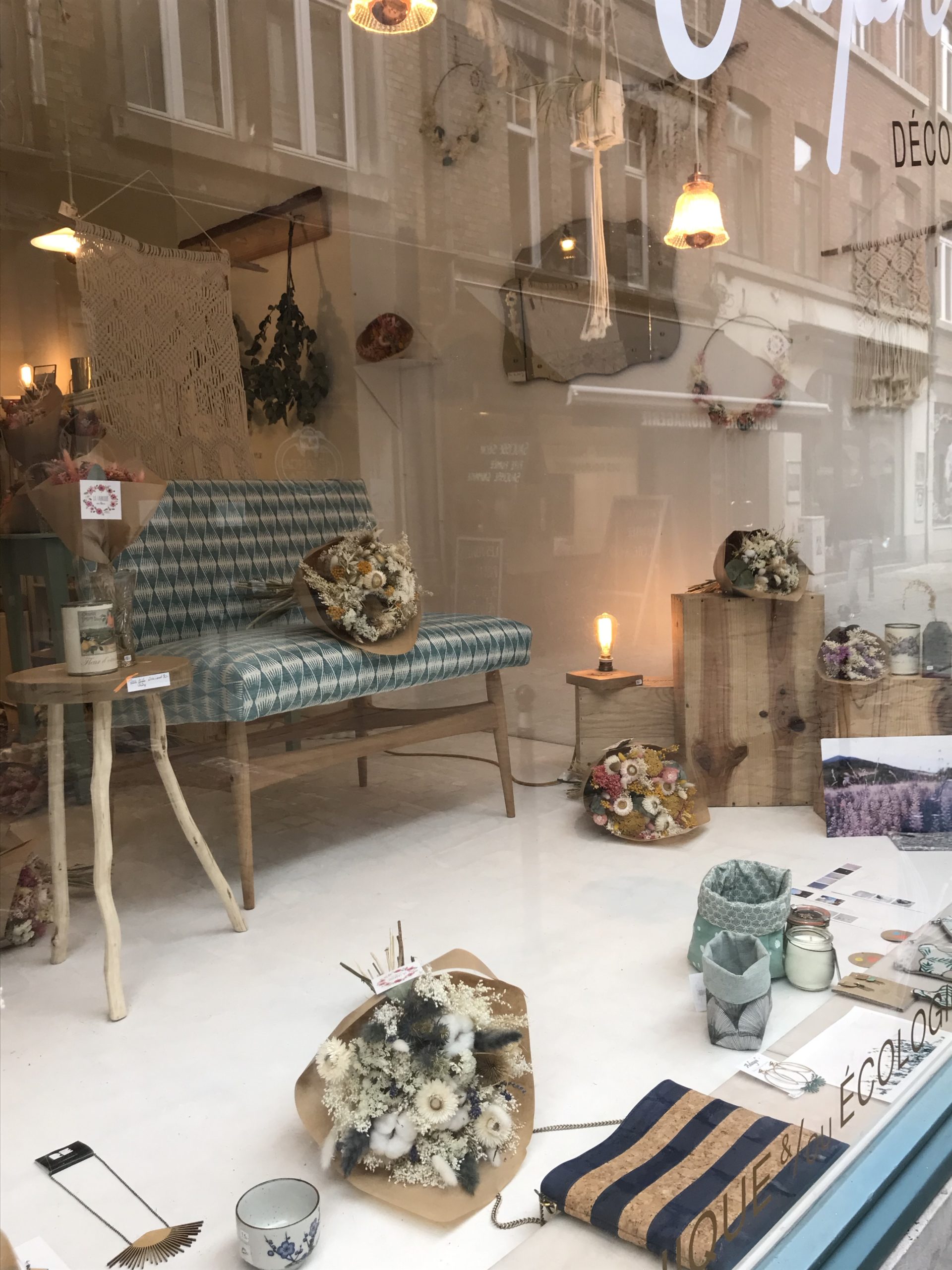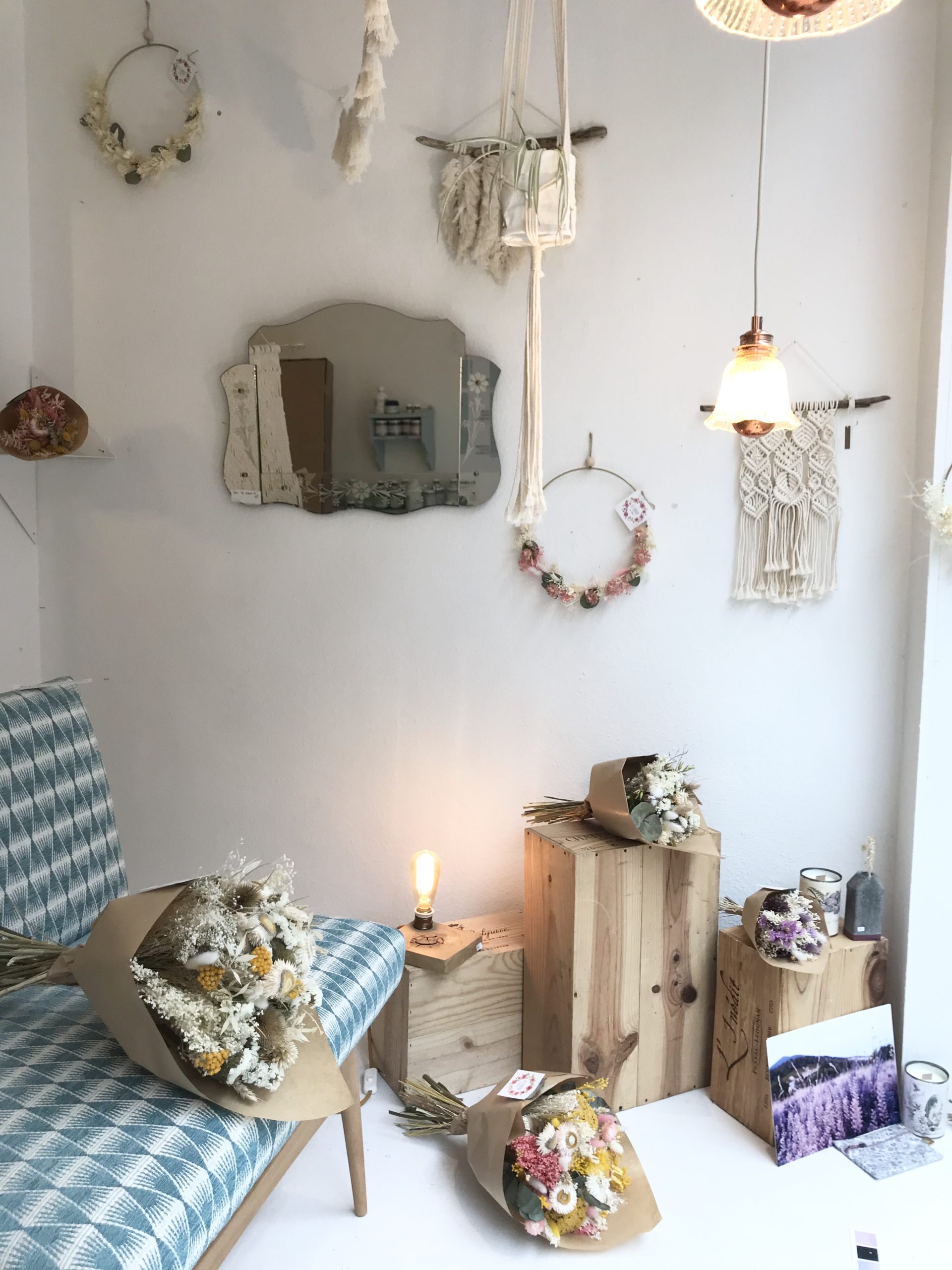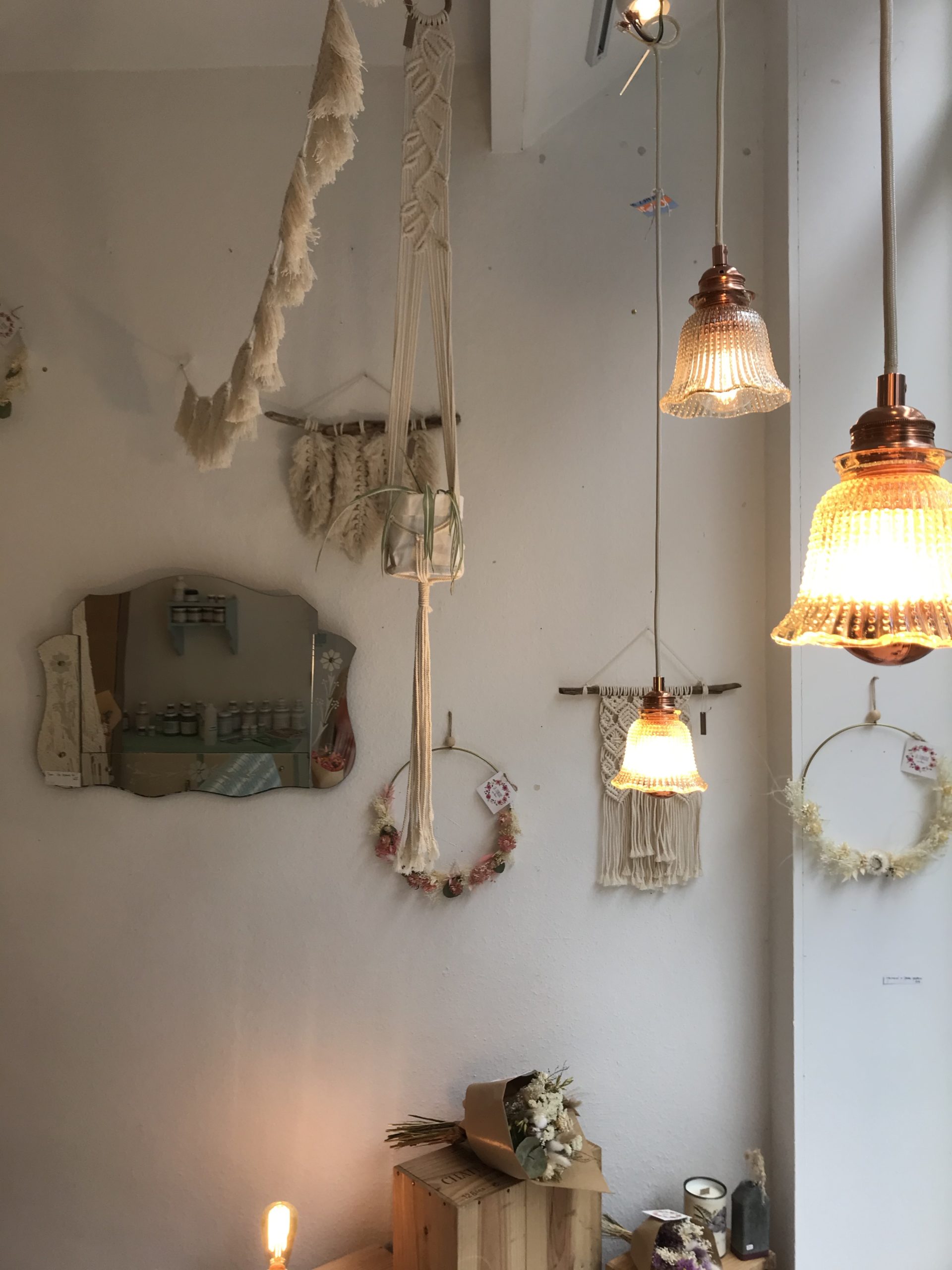 1. Banquette vintage restaurée * La Conciergerie (Namur) – 425 € | 2. Table de salon en chêne artisanale * Livinwood (Namur) – 80€ | 3. Miroir style vénitien vintage * Sapristi ! Une seconde vie – 90€ | 4. Tricotin “Bonheur” * Lalunela (Hainaut) – 34€ | 5. Macramé multi plumes * Mostri Mostrini (Namur) – 75 € | 6. Couronne de fleurs séchées * La Fabrique aux fleurs (Namur) – Moyennes : 30€ – Grandes : 50€ | 7. Bougie cire soja conserve de récup * Zeste de Patine (Namur) – 15€ | 8. Vase en béton * Deer Design (Namur) – 24€ | 9. Collier * Restore (Liège) – 25€ | 10. Pochette en liège * En voiture Simone (Liège) – 130€ et collier * Lilly Babioles (Namur) – 25€ | 11. Tirage A5 * h.O.&M.e. (Namur) – 9 €