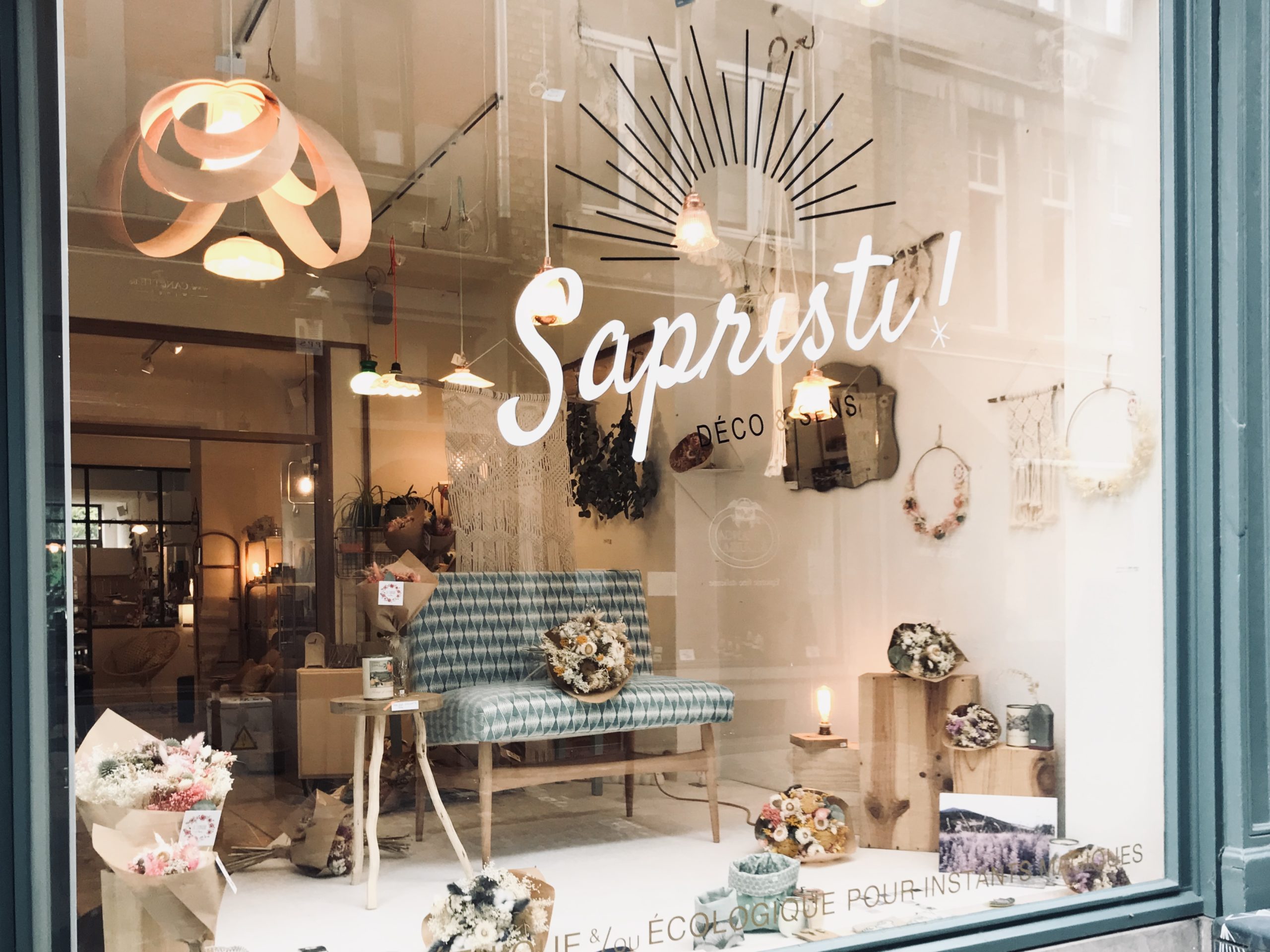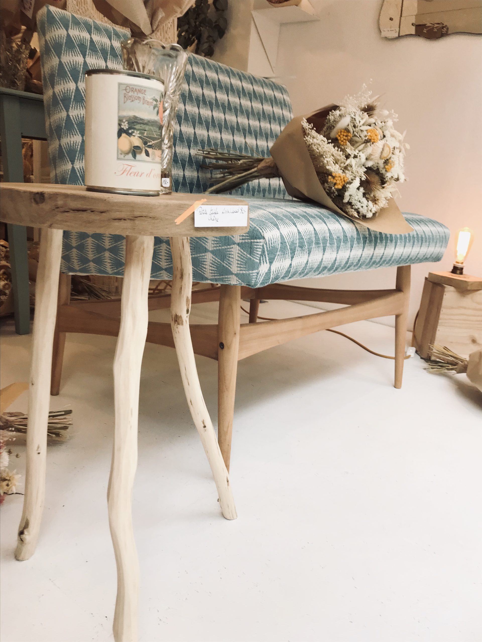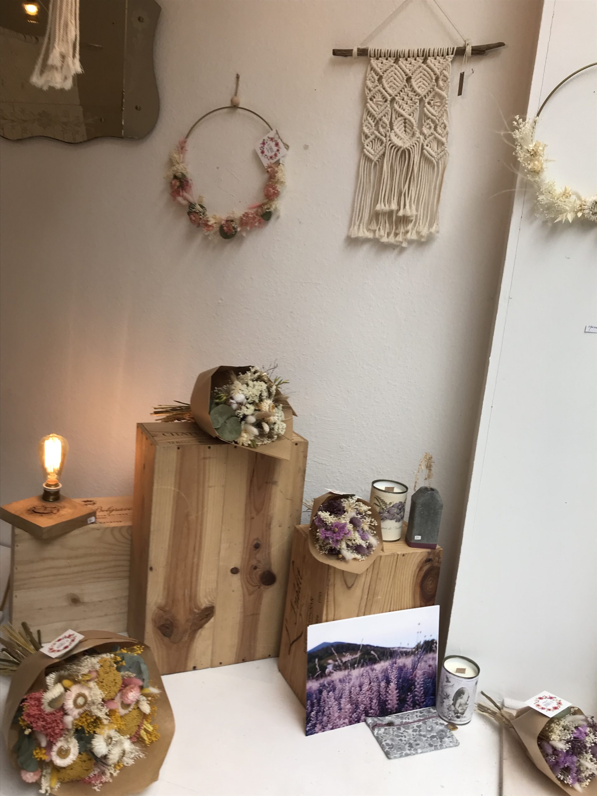 1. Banquette vintage restaurée * La Conciergerie (Namur) – 425 € | 2. Table de salon en chêne artisanale * Livinwood (Namur) – 80€ | 3. Miroir style vénitien vintage * Sapristi ! Une seconde vie – 90€ | 4. Tricotin “Bonheur” * Lalunela (Hainaut) – 34€ | 5. Macramé multi plumes * Mostri Mostrini (Namur) – 75 € | 6. Couronne de fleurs séchées * La Fabrique aux fleurs (Namur) – Moyennes : 30€ – Grandes : 50€ | 7. Bougie cire soja conserve de récup * Zeste de Patine (Namur) – 15€ | 8. Vase en béton * Deer Design (Namur) – 24€ | 9. Collier * Restore (Liège) – 25€ | 10. Pochette en liège * En voiture Simone (Liège) – 130€ et collier * Lilly Babioles (Namur) – 25€ | 11. Tirage A5 * h.O.&M.e. (Namur) – 9 €