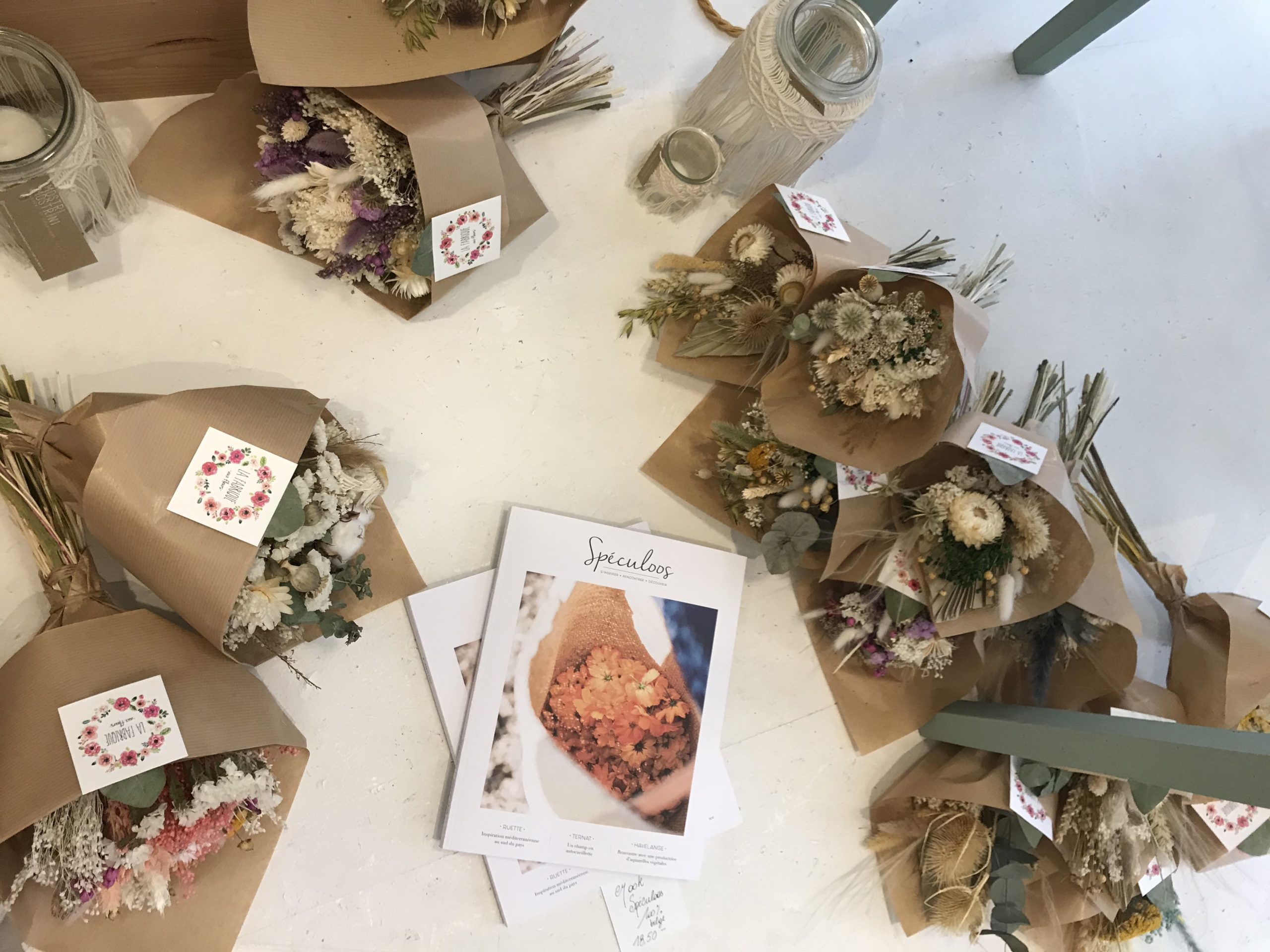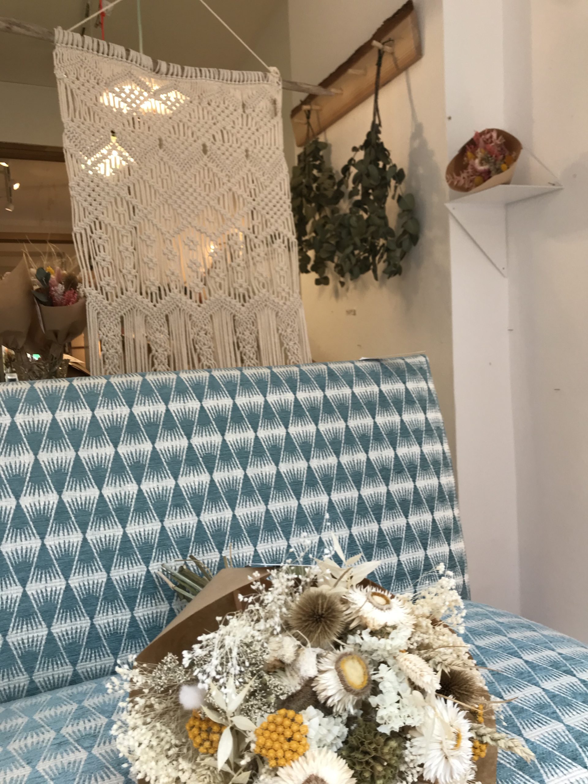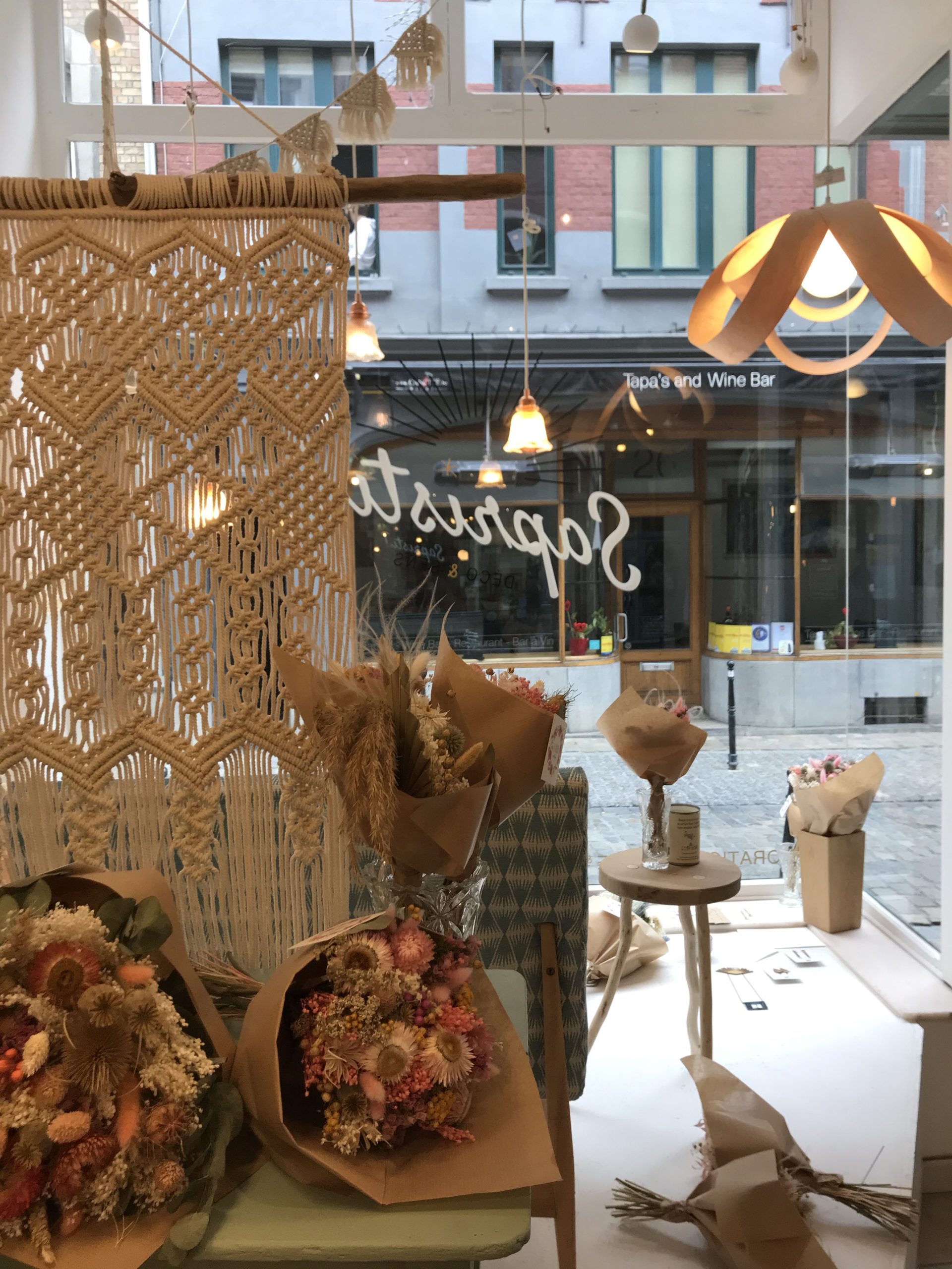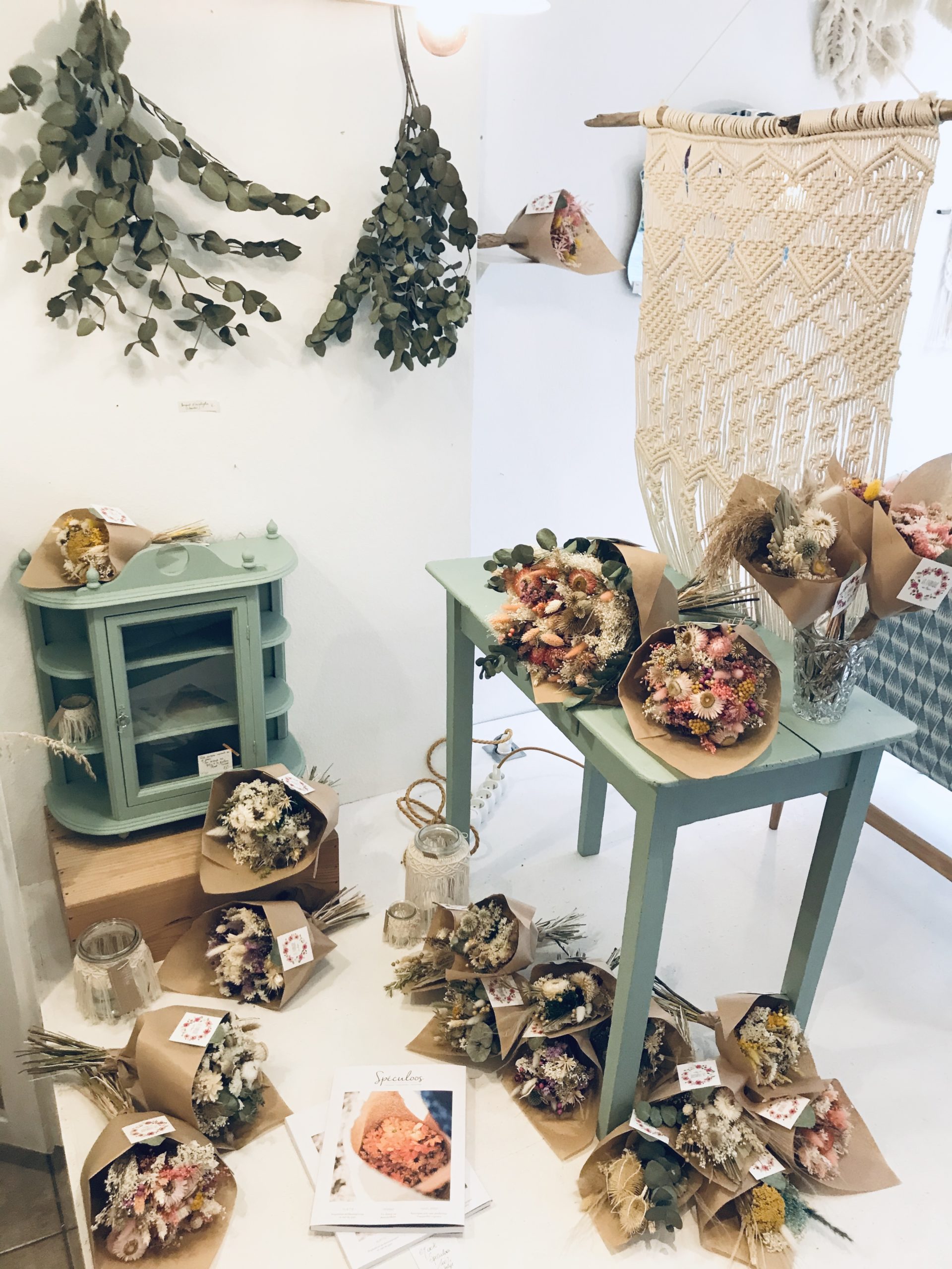 1. Banquette vintage restaurée * La Conciergerie (Namur) – 425 € | 2. Table de salon en chêne artisanale * Livinwood (Namur) – 80€ | 3. Miroir style vénitien vintage * Sapristi ! Une seconde vie – 90€ | 4. Tricotin “Bonheur” * Lalunela (Hainaut) – 34€ | 5. Macramé multi plumes * Mostri Mostrini (Namur) – 75 € | 6. Couronne de fleurs séchées * La Fabrique aux fleurs (Namur) – Moyennes : 30€ – Grandes : 50€ | 7. Bougie cire soja conserve de récup * Zeste de Patine (Namur) – 15€ | 8. Vase en béton * Deer Design (Namur) – 24€ | 9. Collier * Restore (Liège) – 25€ | 10. Pochette en liège * En voiture Simone (Liège) – 130€ et collier * Lilly Babioles (Namur) – 25€ | 11. Tirage A5 * h.O.&M.e. (Namur) – 9 €
