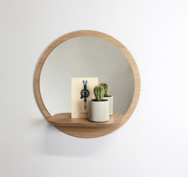 “Let the sunshine in ! Grâce à son étagère en chêne massif, le Sunrise est le miroir idéal pour une salle de bain ou une entrée avec son design tout en rondeur.