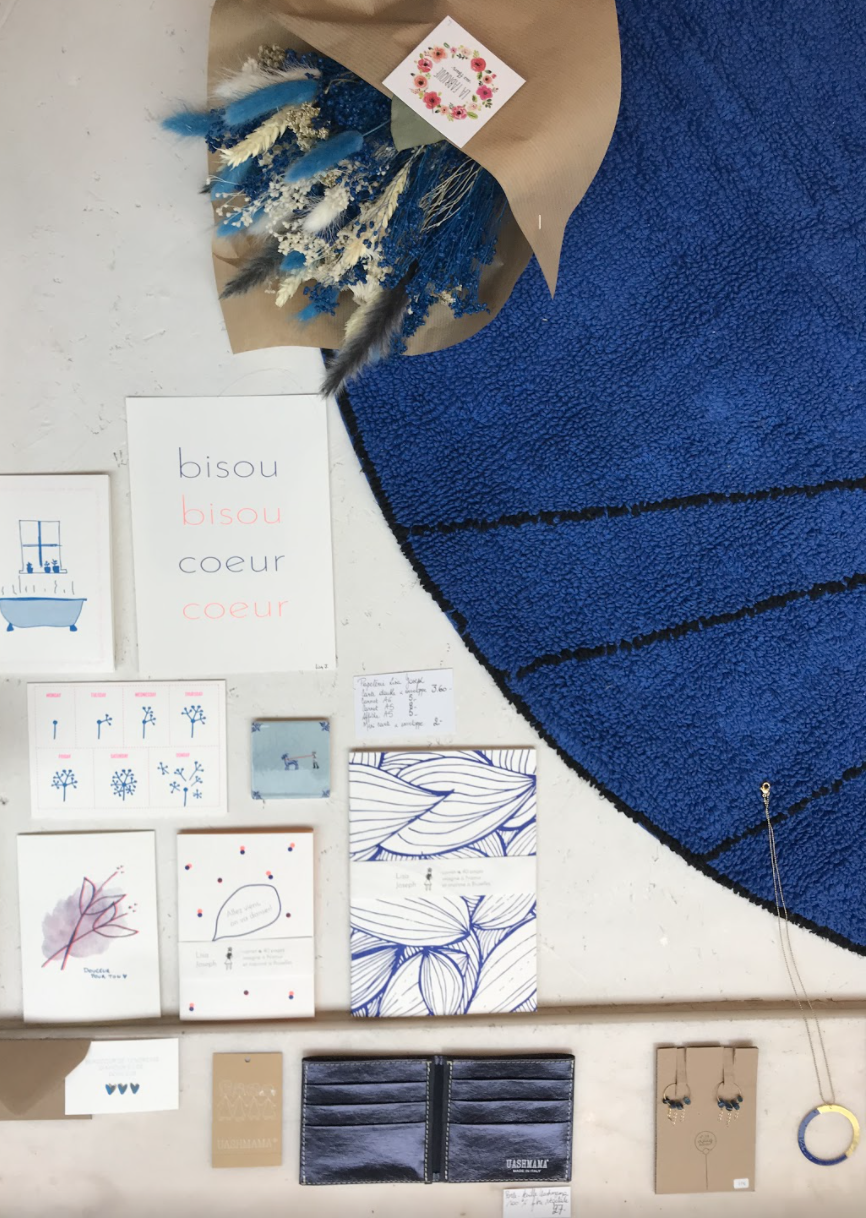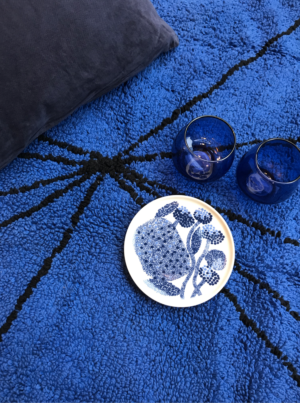 1. Tapis “Trace” bleu Klein * Lorena Canals – 155 € | 2. Coussin velours bleu 40×60 cm * Urban Nature Culture – 49,95€ | 3. Gobelet en fibre de bambou “Pissenlit” bleu * Urban Nature Culture – 4,25€ | 4. Vase mural demi-cercle en céramique bleu * Studio Harm en Elke – 25€ | 5. Photophore bleu électrique “Swinging 70s” * Urban Nature Culture – 9,95 € | 6. Patère confetti “Lou” * Harto – 17,50 € 10,50€ | 7. Affiche A3 “Allez viens, on va danser” * Lisa Joseph ** Créatrice namuroise ** – 18€ | 8. Assiette “Mynsteri” * Marimekko – 19,50€ | 9. Cahier “Feuillages” A5 * Lisa Joseph ** Créatrice namuroise ** – 8€ | 10. Portefeuille bleu métallisé fibre végétale * Uashmama – 27€.